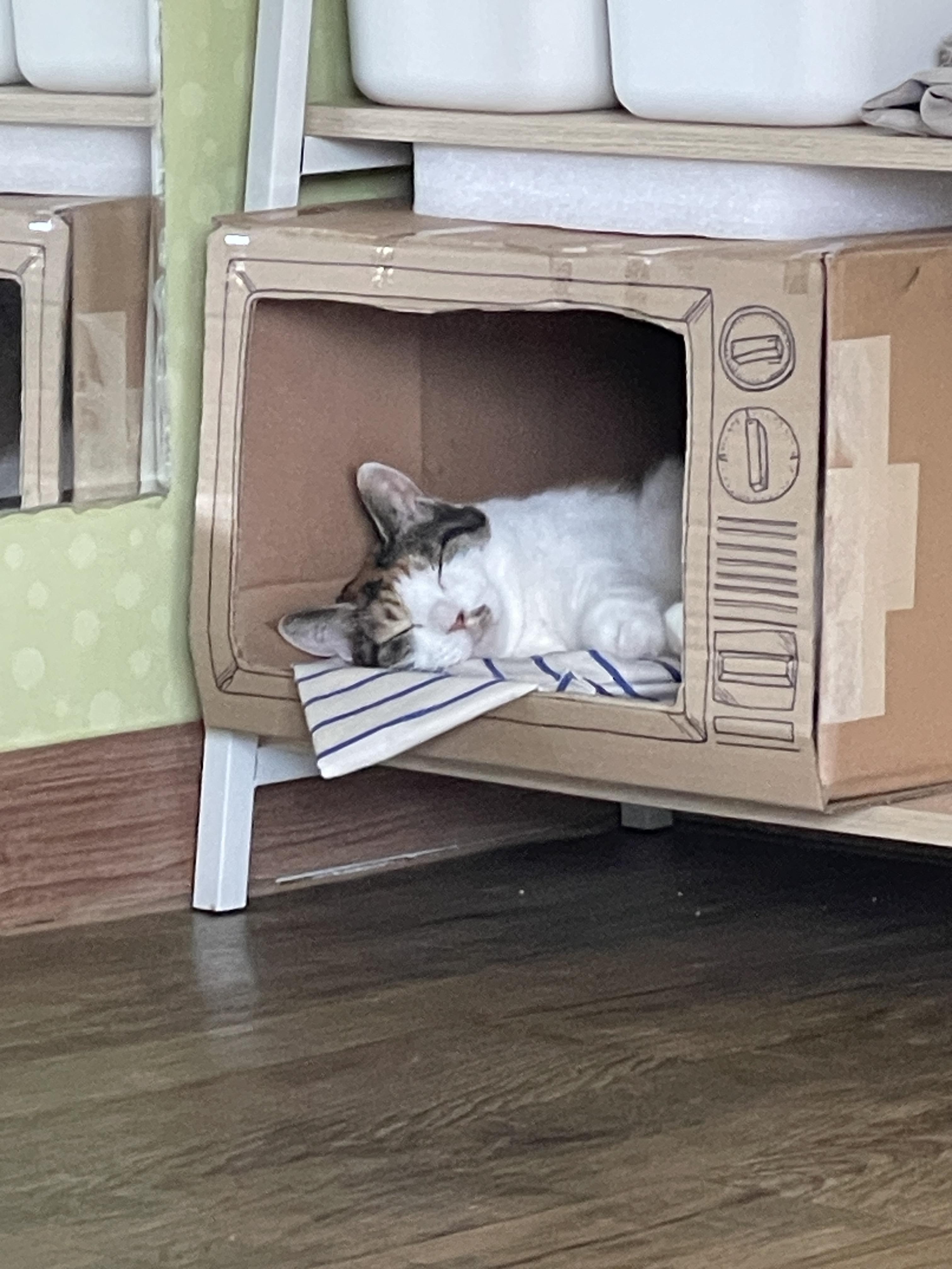 밥 먹고 낮잠 즐기시는 도도 모습이에요. ㅎㅎ 얼마전에 고양이가 상자를 왜 좋아하는지에 관한 짧은 글을 썼는데 ㅎㅎ 그때 만들었던 상자 숨숨집이에요. 지금은 없지만 애들이 이렇게 잘 써줬었어요. ㅎㅎ