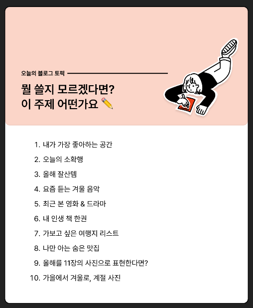 오늘도 힘차게(?) 달려보는 오블완 포스팅입니다. ㅎㅎ 벌써 15일차네요. 와!! 제가 15일 동안 매일 포스팅을 하다니!! 신기하고 저 스스로가 기특하네요 하하. 오늘은 무슨 글을 써볼까 고민을 했는데도 주제를 못 정해서 오늘의 블로그 토픽을 참고해보기로 했어요. 그 중에서 저는 9번을 골랐어요.